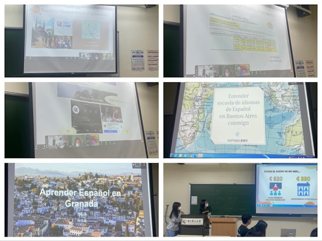 今天報告的班級,才14個同學,總共介紹了8個西語系國家的城市&語言學校,包括布宜諾斯艾利斯(阿根廷首都)、聖荷西(哥斯大黎加首都)、馬德里、巴賽隆納、格拉納達(以上為西班牙的城市)、Tenerife島(西班牙的小島)、還有美國的費城。