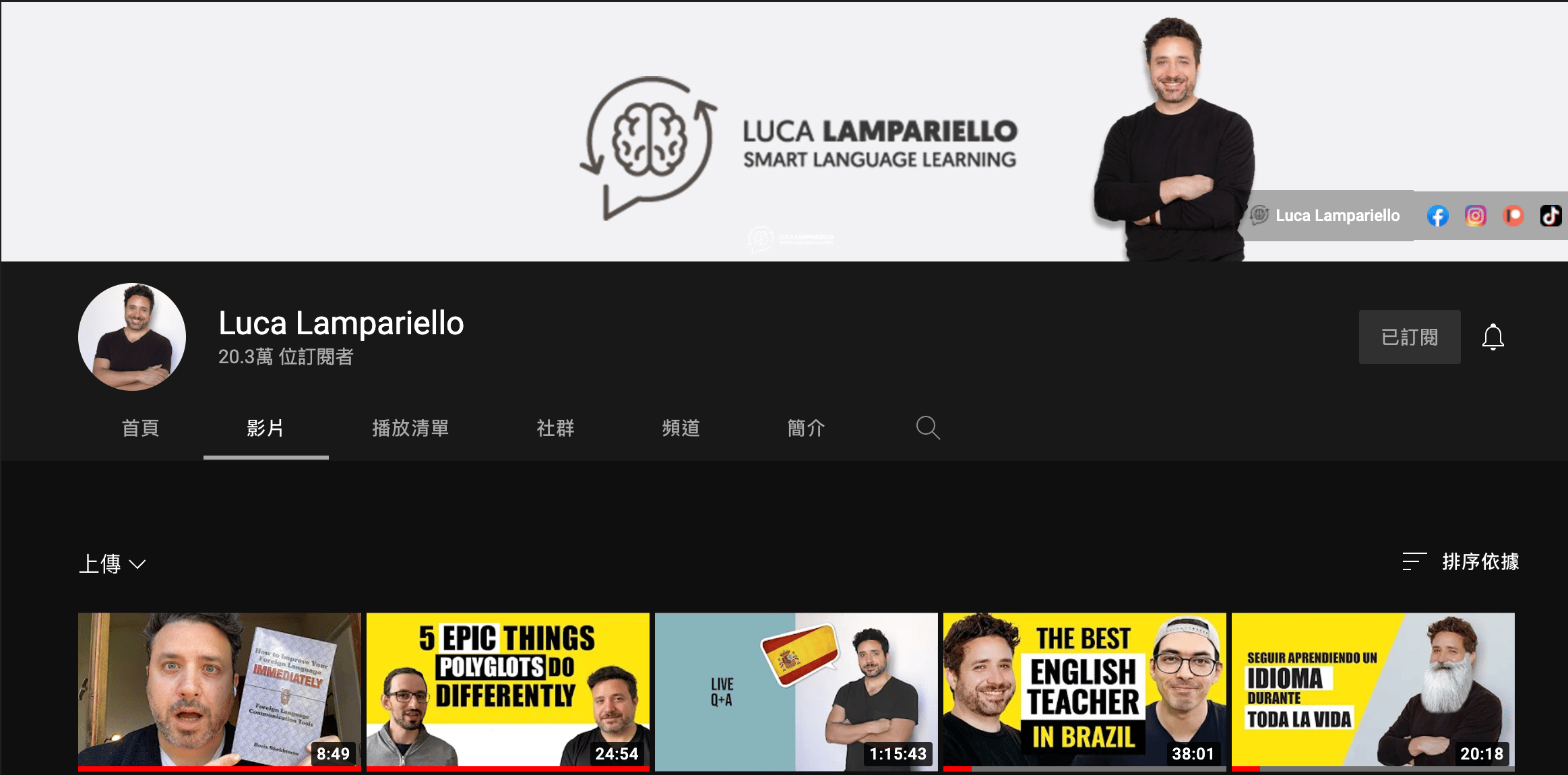 Luca Lampariello的多語教學youtube頻道上,大多是以英文發音,分享關於多語學習的一切。近期也開始製作西班牙語發音的內容,從影片可以看到他的西語、英語的流利程度都逼近母語者等級,毫無義大利口音,實在令人非常佩服,也因此他提供的語言學習方法,說服力十足。